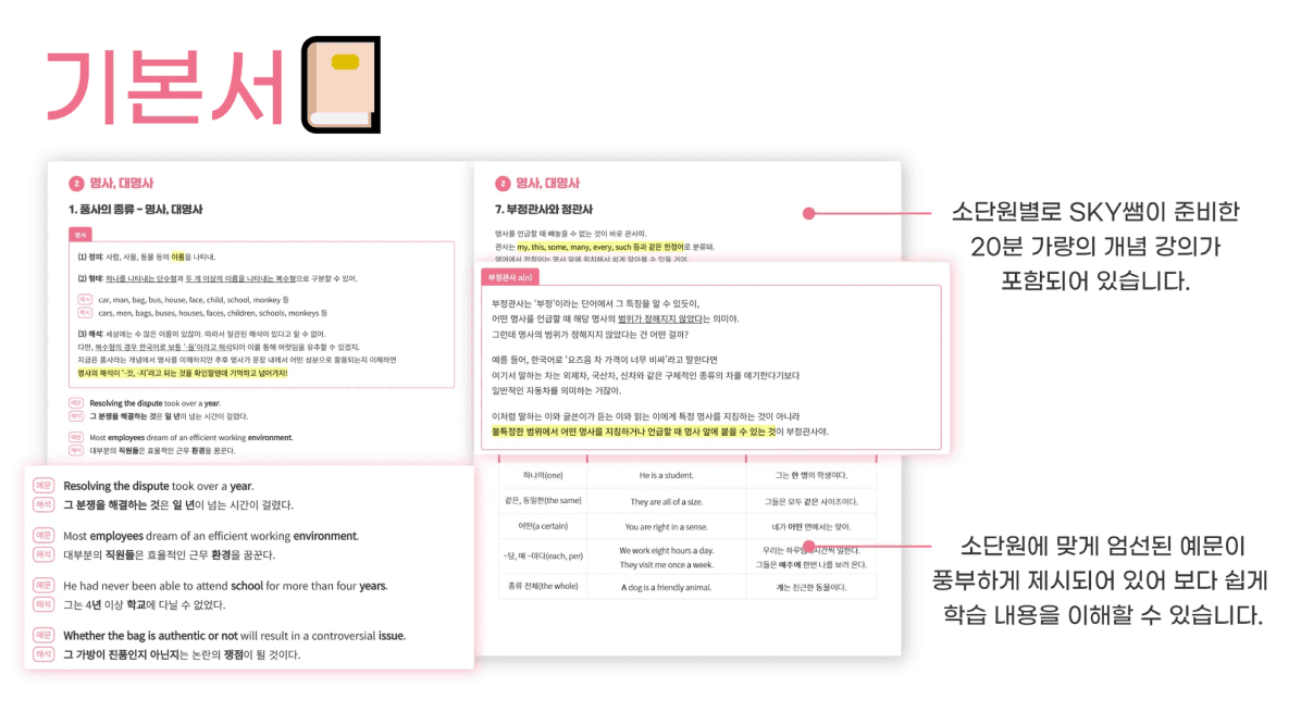 개념 강의, 예제, 핵심 문제 3단계로 구성. 여기에 대표