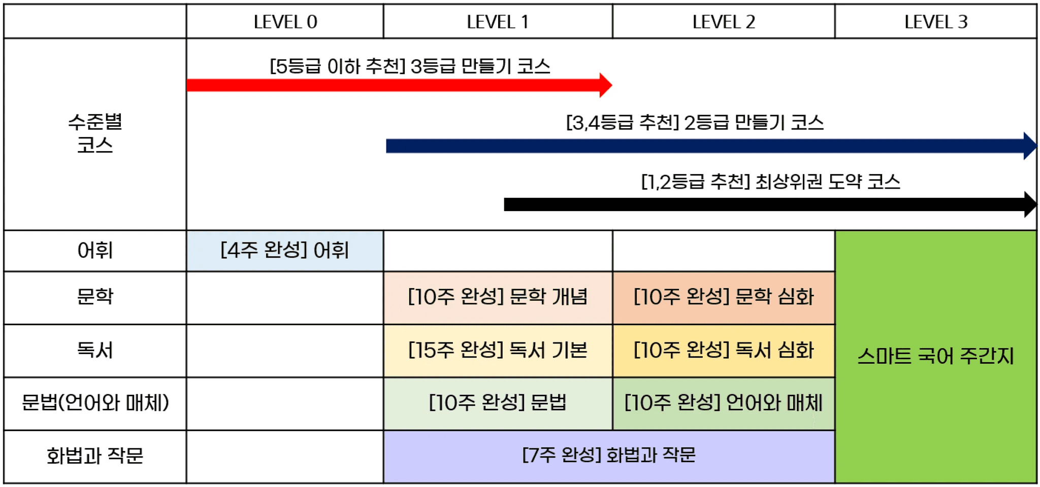 LEVEL 1 (워크북 문제만) → LEVEL 2 (심화서+워크북) / LEVEL 3 주간지
