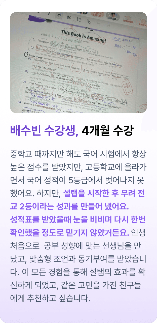 성적표를 받았을때 눈을 비비며 다시 한번 확인했을 정도로 믿기지 않았거든요. 인생 처음으로 공부 성향에 맞는 선생님을 만났고, 맞춤형 조언과 동기부여를 받았습니다. 이 모든 경험을 통해 설탭의 효과를 확신하게 되었고, 같은 고민을 가진 친구들에게 추천하고 싶습니다.