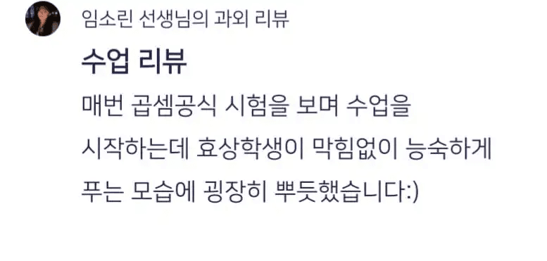 소린 쌤 | “그동안 설탭에서 많은 학생을 만나며 좋은 기억이 많이 남아 있어요. 비대면인데도 이렇게 효상 학생처럼 유대관계를 형성할 수 있다는 점도 특별했고요. 오프라인 과외에서 어쩔 수 없이 낭비되는 시간이 있는데, 그런 것 없이 알차게 학생들과 공부할 수 있어서 바쁜 와중에도 시너지를 낼 수 있었던 것 같아요. 효상 학생과 긴 시간 함께 공부하면서 정도 많이 들었는데 이렇게 수업을 종료하게 되어 아쉽지만, 좋은 결과로 마무리할 수 있어서 기쁘고요. 그동안 정말 수고 많았다고 이야기해 주고 싶어요.”