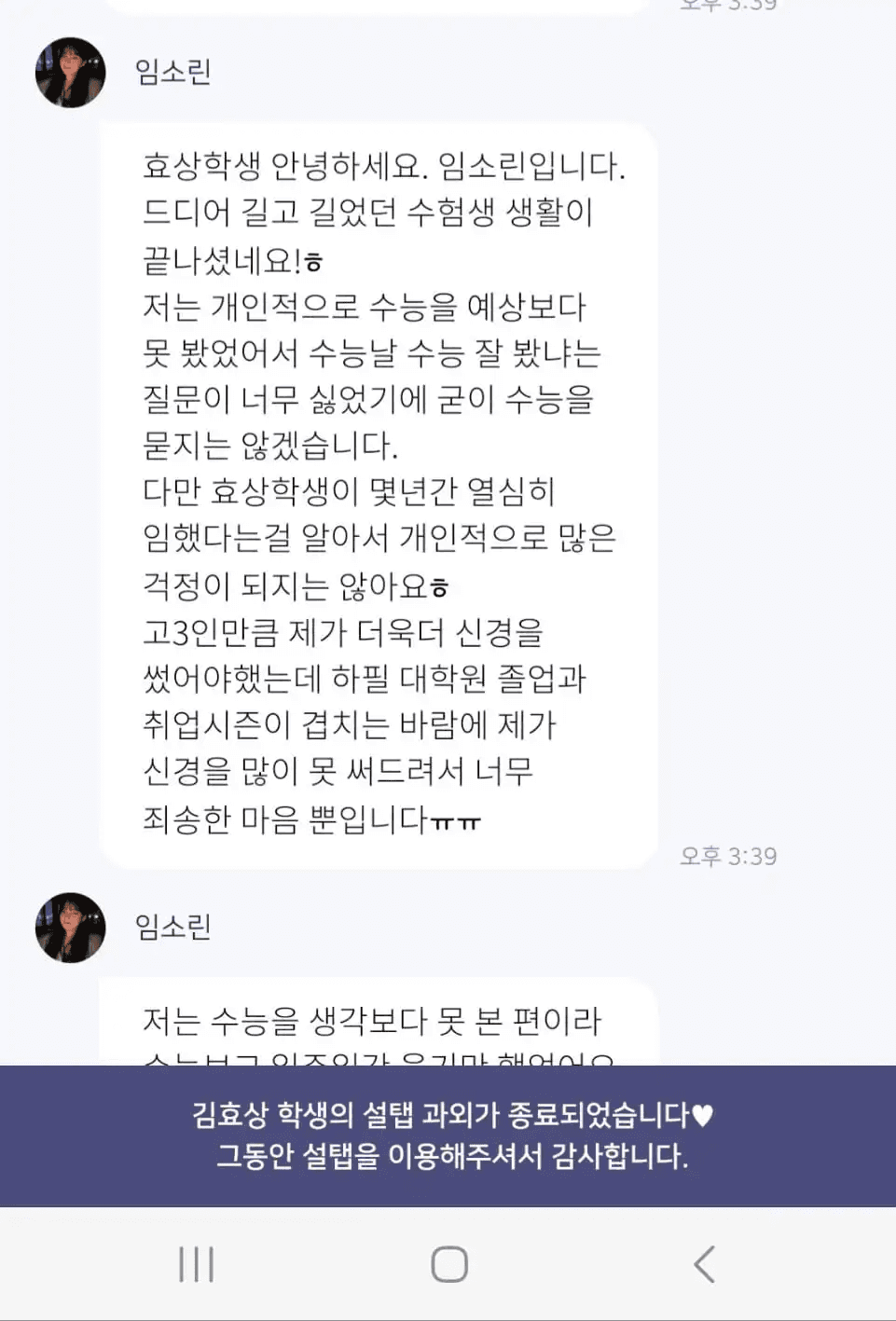 그렇게 마지막 수업을 마치며 소린 쌤과 효상이는 각각 설탭 수업을 종료했어요. 이제 사회인이 될 채비를 하기 위해 소린 쌤은 효상이를 끝으로 설탭 수업을 종료했고, 효상이 역시 희망하던 아주대 심리학과에 합격하여 대학생이 될 준비를 마쳤죠.