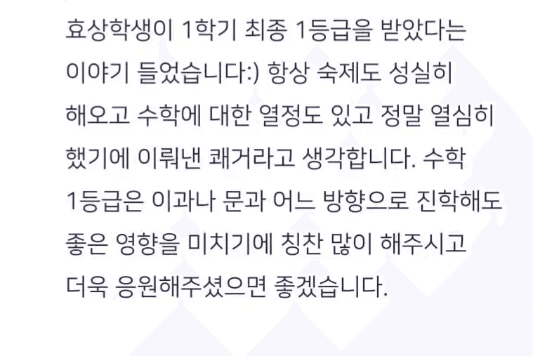 덕분에 설탭 과외를 받으며 처음 80점이던 중학교 내신에서는 100점을, 고등학교 수학 내신에서는 1~2등급을, 모의고사에서는 2~3등급이라는 만족할 만한 점수를 얻게 되었죠.